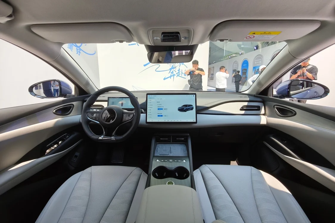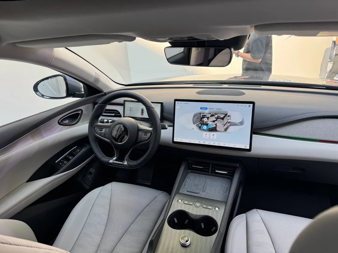 内饰方面,新车延续了家族式的设计语言,提供海韵灰和深曜黑两种选择。中控区域搭载12.8英寸可旋转中控屏,配合DiLink 100智能网联系统,为用户带来智能车机交互体验,另外高配车型中控屏尺寸为15.6英寸。其他实用配置也相当齐全,包括50W无线充电、前排座椅加热/通风、车载冰箱、全景天窗(带遮阳帘)以及电动尾门等。