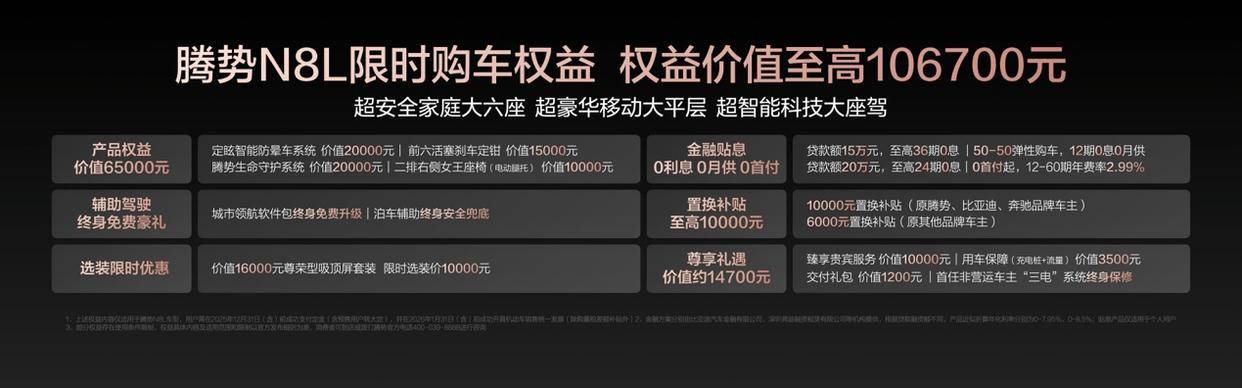 大六座安全豪华SUV腾势N8L成都站正式上市时间:2025-11-14 11月14日,腾势汽车在成都举行了腾势N8L的试驾暨上市活动。作为一款主打家庭出行的大六座 SUV,新车在空间、舒适性、安全配置与智能化方面进行了系统性升级。发布会同时公布了车型售价及相关购车政策。腾势 N8L 的官方指导价为 29.98 万元至 32.98 万元。为支持用户购车,官方推出了阶段性的购车权益,包括金融方案、置换补贴及交付保障等措施。