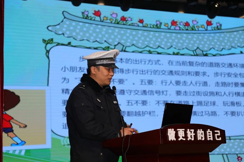 “左转弯手势,右转弯手势,直行手势...” 在场的学生跟随民警史东学习了交警常用的交通指挥手势,孩子们热情高涨、兴趣十足。
