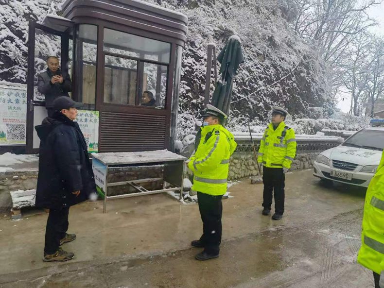 西安降雪,秦岭山中已是银装素裹,交警长安秦岭中队民警对210国道积雪路段勘察,经请示上级部门,在沣峪口对210国道秦岭段实施临时交通管制,对进山车辆进行劝返,对辖区村民车辆检查防滑链,提醒安全驾驶后让其通行,持续加强积雪结冰路段巡逻勘察。