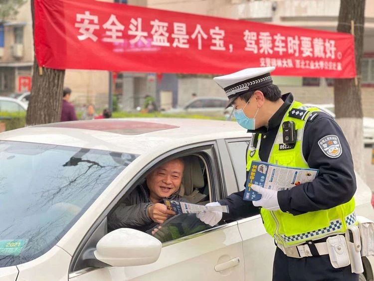 3月15日(星期一)早上七点,交警碑林大队在上学高峰期组织警力在西北工业大学校园口掀起“一盔一带及车让人 人守规”教育宣传热潮,对附中、附小、附属幼儿园接送孩子上下学家长们进行面对面、点对点的交通安全教育,和学校公安处同志一同向孩子及家长讲解骑摩托车、电动车佩戴头盔的重要性和必要性,告知驾乘人“如何正确佩戴头盔,能够将交通事故的死亡风险降低60%~70%”这一研究数据,用真实调研数据督促提醒家长们提升佩戴头盔、开车系安全带的自觉性和主动性,为学生做好示范引领。
