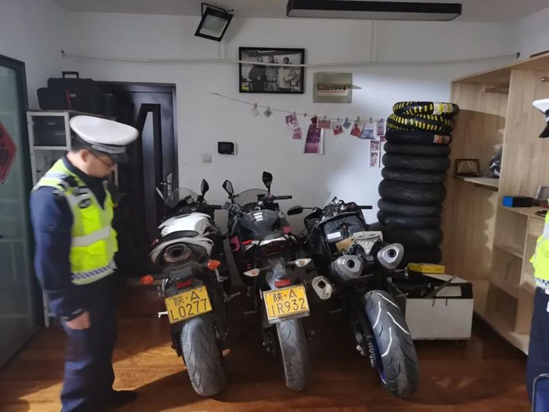 接到举报后 西安交警长安大队副大队长李建龙 带领20余名民警统一集结出发 前往被举报的摩托店进行突击检查