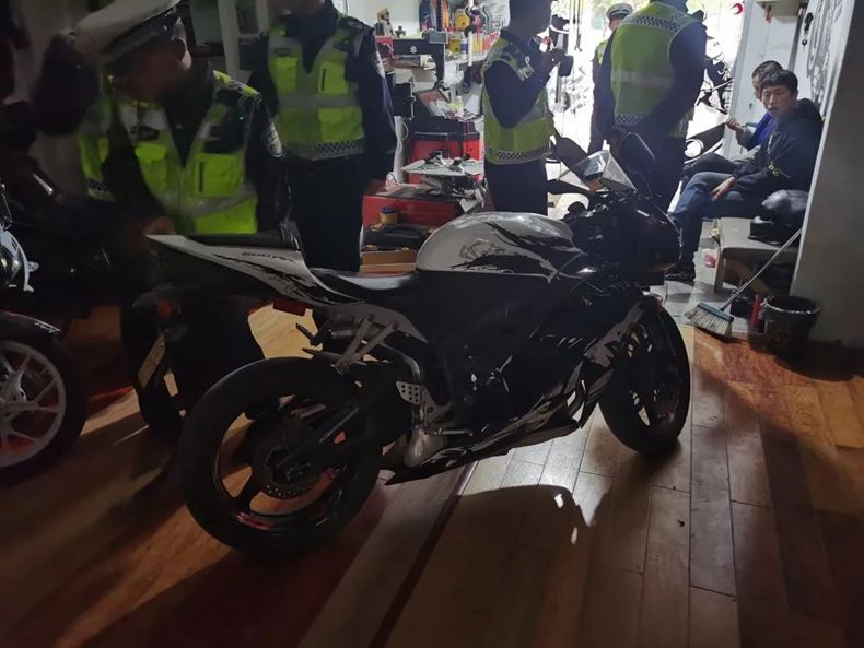 经检查,该车行有2辆无牌摩托车型号与群众举报一致,存在擅自改变机动车已登记的结构、构造的交通违法行为,且车行负责人现场未能提供以上车辆的相关手续,民警随即依法对以上车辆进行了扣留。