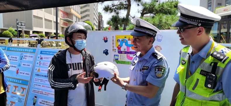 民警现场对驾乘机动车未按规定使用安全带、非机动车违法行为进行查处,同时对未佩戴头盔的驾驶员进行劝导。