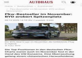 近日,BYD SEAL U(宋PLUS)成为德国11月车市插混车型销量冠军,引发行业广泛关注。这不仅是中国汽车品牌首次在德国主流细分市场登顶,更意味着比亚迪在欧洲的规模化突破已进入全新阶段,印证中国新能源车海外的深度认可。其中,在德国市场,比亚迪1-11月累计销量为19,197辆,同比增长逾647.5%;11月销量为4,026辆,同比激增逾834.1%,市场份额提升至1.6%。在英国市场,比亚迪1-11月累计销量为43,740辆,同比增长488.5%。在西班牙市场,比亚迪1-11月累计销量为22,358辆,同比增长452.3%;11月销量为2,934辆,同比增长267.7%,以19.2%的市场
