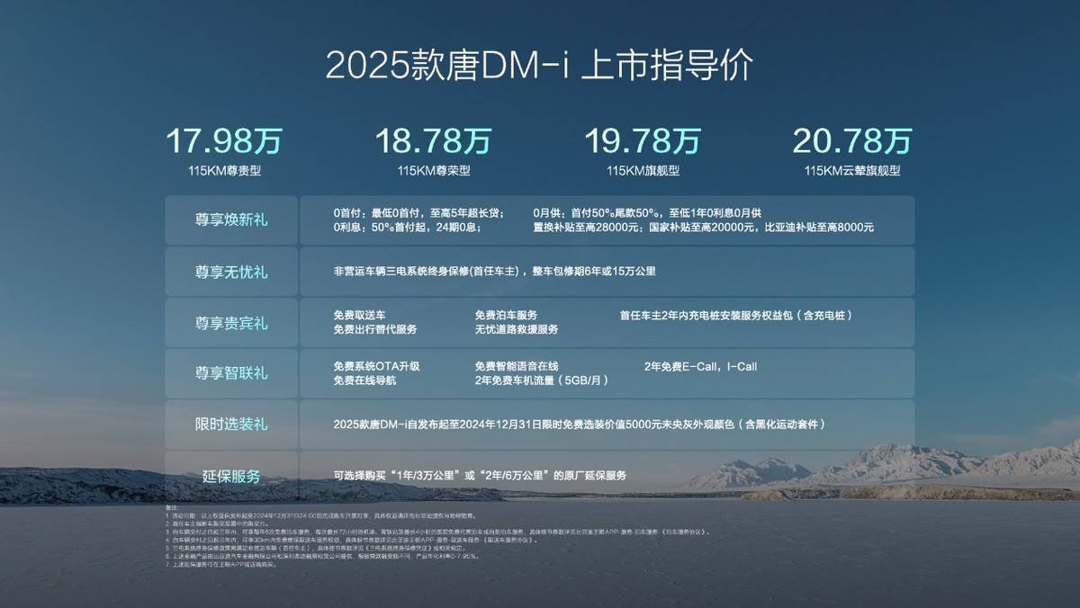 大唐生活家,为爱再进化,2025款唐DM-i通过三大进化与丰富配置,赋能家庭出行品质进阶,打造更适合中国家庭的大七座SUV,成为家庭SUV最优解、用户买车最优解、家庭出行最优解。同时,唐家族也将加速颠覆合资燃油,再次树立20万级家用SUV价值新标杆! 此次,2025款唐DM-i共推出4款车型,售价17.98万~20.78万元。同时,比亚迪为用户准备了包括“尊享焕新礼、尊享无忧礼、尊享贵宾礼、尊享智联礼、限时选装礼、延保服务”六重购车礼遇。