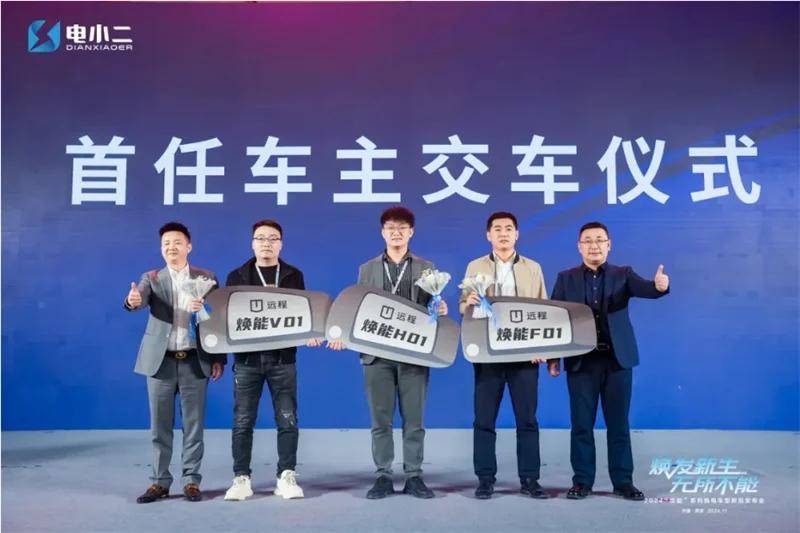 远程新能源商用车集团副总裁、轻商事业部总经理杨东及电小二新能源科技有限公司创始人、董事长张一凡为首任车主代表姚永胜、刘昊刚、宋文杰颁发交车钥匙。