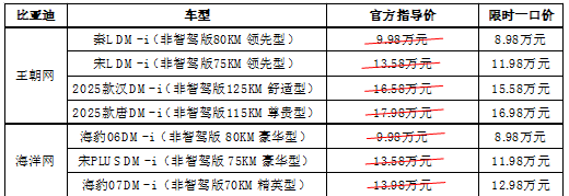 比亚迪王朝、海洋网非智驾版现车限时一口价,最低8.98万元起时间:2025-03-31 为回馈广大用户的支持与厚爱,日前,比亚迪王朝网和海洋网纷纷推出“限时一口价”活动。 比亚迪王朝网官宣,4款非智驾版热销车型,秦L DM-i(非智驾版)限时一口价8.98万元起,宋L DM-i(非智驾版)限时一口价11.98万元起,2025款汉DM-i(非智驾版)限时一口价15.58万元起,2025款唐DM-i(非智驾版)限时一口价16.98万元起。 比亚迪海洋网官宣,3款非智驾版热销车型,海豹06DM-i(非智驾版)限时一口价8.98万元起,宋PLUS DM-i(非智驾版)限时一口价11.98万元起,海豹07DM-i(非智驾版)限时一口价12.98万元起。