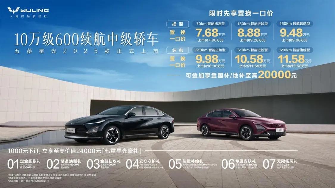 此外还可以叠加国补/地补至高20000元。上市即日起至2025年6月30日,在五菱汽车官方渠道以1000元下订,还可享至高价值24000元的「七重星光豪礼」,包括定金膨胀礼:1000元定金抵2000元车款;装备焕新礼:全系至高10000元置换补贴;金融助攻礼:全系享4000元金融贴息;安心守护礼:首任非营运车主享价值3000元三电终身质保;能量补给礼:纯电车型赠送价值1500元7kW充电桩(不含安装,且具备安装条件);专属皮肤礼:全系赠送价值3000元龙膜太阳膜(不含安装);无限畅玩礼:全系赠送3年免费无限车机流量。