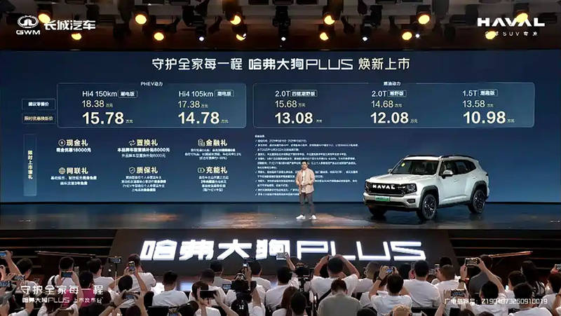 9月15日,长城汽车哈弗品牌旗下的中型SUV—哈弗大狗PLUS正式上市,并推出了5款车型可选,包含燃油版和PHEV插混版,售价区间为13.58-18.38万元,限时焕新价为10.98-15.78万元。新车是哈弗二代大狗的改款,并更新了命名,燃油版搭载了1.5T和2.0T发动机,而PHEV车型配备的是1.5T Hi4四驱电混系统。