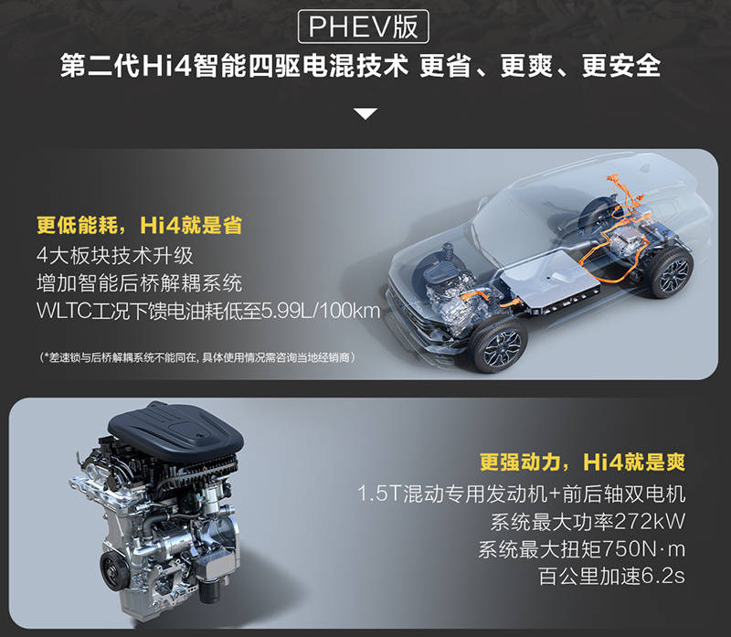 PHEV插混版则搭载的是Hi4智能四驱电混技术,这是由1.5T混动专用发动机+前/后轴双电机所组成,并支持智能后桥解耦,系统的最大功率为268kW,峰值扭矩为750N·m,并与2挡DHT混动专用变速器相匹配。同时还提供了容量为18.74kWh和27.54kWh这两种磷酸铁锂电池组可选,对应的CLTC纯电续航里程分别为105km和150km。另外,新车还支持3.3kW的220V对外放电功能。