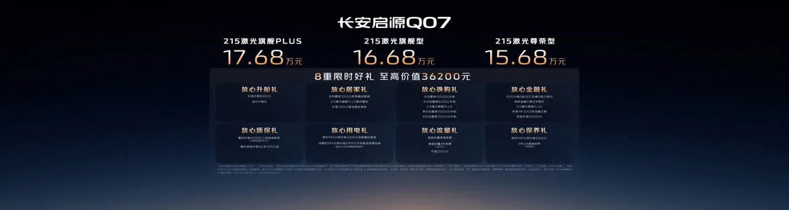 长安启源Q07天枢智能激光版上市,售价15.68万元起时间:2025-10-10 10月10日,长安启源Q07天枢智能激光版正式上新,共推出3款产品,分别为215激光尊荣型、 215激光旗舰型和215激光旗舰PLUS,上新价为15.68万元- 17.68万元。 为让更多家庭用户轻松享受越级智能出行体验,长安启源同步推出多重价格权益,现在下订即可享受8重专属好礼,至高总价值36200元,并有五大承诺兜底,确保让每一位用户都能享受到安心、舒心、省心的服务体验。