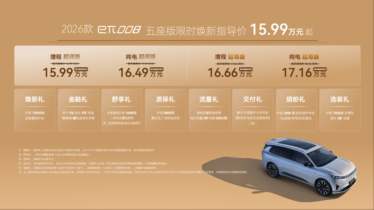 既要家的宽敞,也要家的舒适惬意,2026款eπ008五座版打造“移动的家庭舒适舱”,把家的“超级大舒享”也搬到了车上。其搭载同级唯一的二排电动魔毯座椅,可形成0.8平米的超大休息空间;主副驾座椅放倒后可连接形成超2米L型双边“贵妃榻”,无论是宝妈照料孩童、长途陪伴长辈,还是工作间隙的小憩,2026款eπ008五座版都能轻松满足家庭用户的多元舒适需求,让全家人都能找到最舒服的姿势。 央企严选品质硬,家庭用车更放心。2026款eπ008五座版提供增程、纯电两种动力,超阔版、超尊版两种配置,共计四款产品,限时焕新指导价15.99-17.16万元,还可享受包含金融礼、质保礼、交付礼、选装礼、流量礼等多重上市权益。