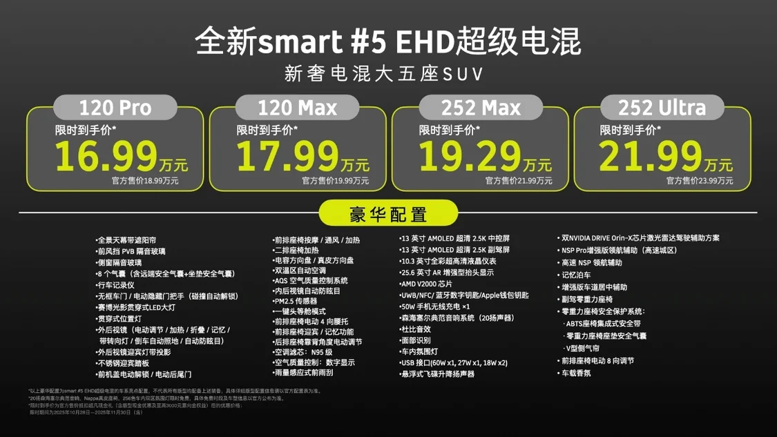 smart #5 EHD超级电混正式上市,限时到手价16.99万元起时间:2025-10-29 10月28日,smart品牌旗下首款插电混动SUV——#5 EHD超级电混正式上市,共推出4款车型,限时到手价16.99-21.99万元。