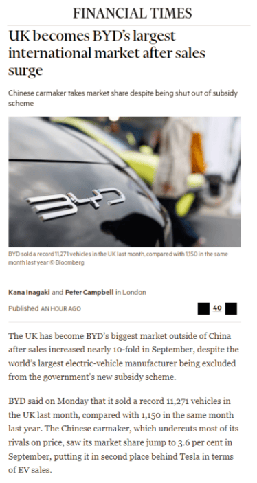 图2:英国广播公司(BBC):中国电动汽车巨头比亚迪在英国销量激增880% 图3:《泰晤士报》:中国新晋品牌比亚迪超越英国老牌汽车品牌 图4:《金融时报》:英国销量飙升,成为比亚迪最大的国际市场 “了不起”的成绩背后,是比亚迪在英国市场从零到一开拓深耕的“不容易”。2023年,比亚迪乘用车初次进入英国市场时,英国消费者对这个中国品牌知之甚少,只有单一车型,主流经销商集团顾虑重重。为打开局面,比亚迪团队采取“多管齐下”的攻坚策略,通过高频拜访经销商、打造店端活动样本等举措,快速引入完整的车型布局,逐步构建起强大的渠道体系力。 从首批4家先锋店开业,到如今过百家门店覆盖英国全境主要地区,比亚迪仅用了两年时间,便将渠道合作的态势彻底逆转:最初是比亚迪寻求与经销商合作开店,如今变成了经销商主动排队争取合作。 英国市场的突破,只是比亚迪全球化布局的一个缩影。截至2025年10月,比亚迪新能源汽车已远销全球117个国家和地区,而其全球化产能与物流体系也在同步升级。比亚迪巴西工厂10月迎来比亚迪全球“第1400万辆新能源汽车”下线,巴西总统卢拉亲临见证,并成为比亚迪车主。同时,比亚迪8艘汽车运输船也已全部投入运营,构建起“高效、安全、环保”的全球物流网络,有力保障产品及时交付至全球用户。 从“中国品牌”到“全球玩家”,比亚迪携新能源旗舰先锋在英国市场的两年逆袭,不仅印证了中国汽车的技术实力,更为中国车企提供了“渠道深耕 + 本地化运营”的出海范本。展望未来,比亚迪将继续深化在全球主要市场的产业布局,坚持本地化运营,以创新科技与绿色理念为驱动,助力全球汽车产业迈向可持续未来。 |