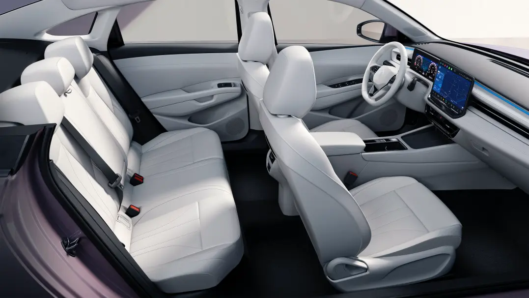内饰方面,新车采用北欧家居风设计,通过材质升级与空间重构,营造出媲美B级车的质感。全系标配10.25英寸数字液晶仪表与12.9英寸悬浮式中控屏,高配车型提供手机无线充电面板、30色氛围灯及全景天窗。