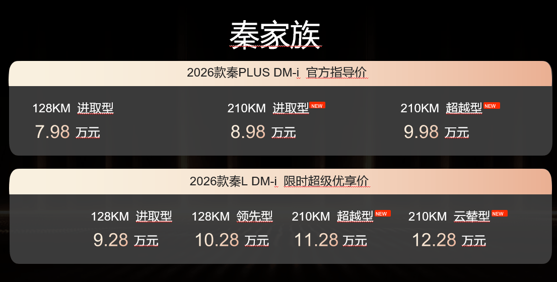 续航全面跃升,插混进入“纯电主导”时代 本次上市的核心亮点之一是纯电续航的大幅提升。2026款秦L DM-i与秦PLUS DM-i均搭载25.3度大容量电池,纯电续航达到210公里,成为8万同级最长插混纯电续航产品。对于日常通勤距离在20-40公里的用户而言,可实现“一周一充”甚至“两周一充”,真正实现城市通勤零油耗,大幅降低用车成本。 宋Pro DM-i的纯电续航也提升至220公里,进一步强化了其作为家庭SUV在短途纯电出行场景下的实用性。配合比亚迪第五代DM技术,三款车型在实现长纯电续航的同时,百公里亏电油耗仍保持在低水平,真正做到了“用电省、用油也省”。 配置进阶,智能与舒适全线升级 在续航提升的基础上,三款车型在配置层面也实现了多项升级: 2026款秦L DM-i在智能驾驶方面配备天神之眼C辅助驾驶系统,支持高速领航、智能跟车、自动泊车等功能,显著减轻长途驾驶负担。
