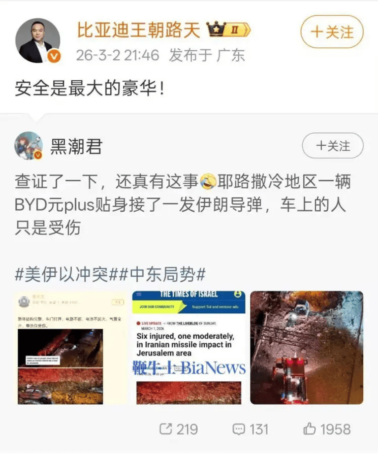 比亚迪元PLUS“硬抗导弹”,实力证明安全性首屈一指时间:2026-03-04 3月1日,一枚伊朗导弹在耶路撒冷周边爆炸。报道称,导弹爆炸后在路面留下明显弹坑,周边多辆汽车受损严重,交通标志牌被直接炸飞,可见爆炸威力之大。图中可见一辆比亚迪元PLUS(海外名称ATTO 3)贴身接了一发导弹,不幸被爆炸波及。受波及的比亚迪元PLUS,虽难逃外部损伤,其车窗碎裂、车体变形、外观受损,但核心表现让人意外。